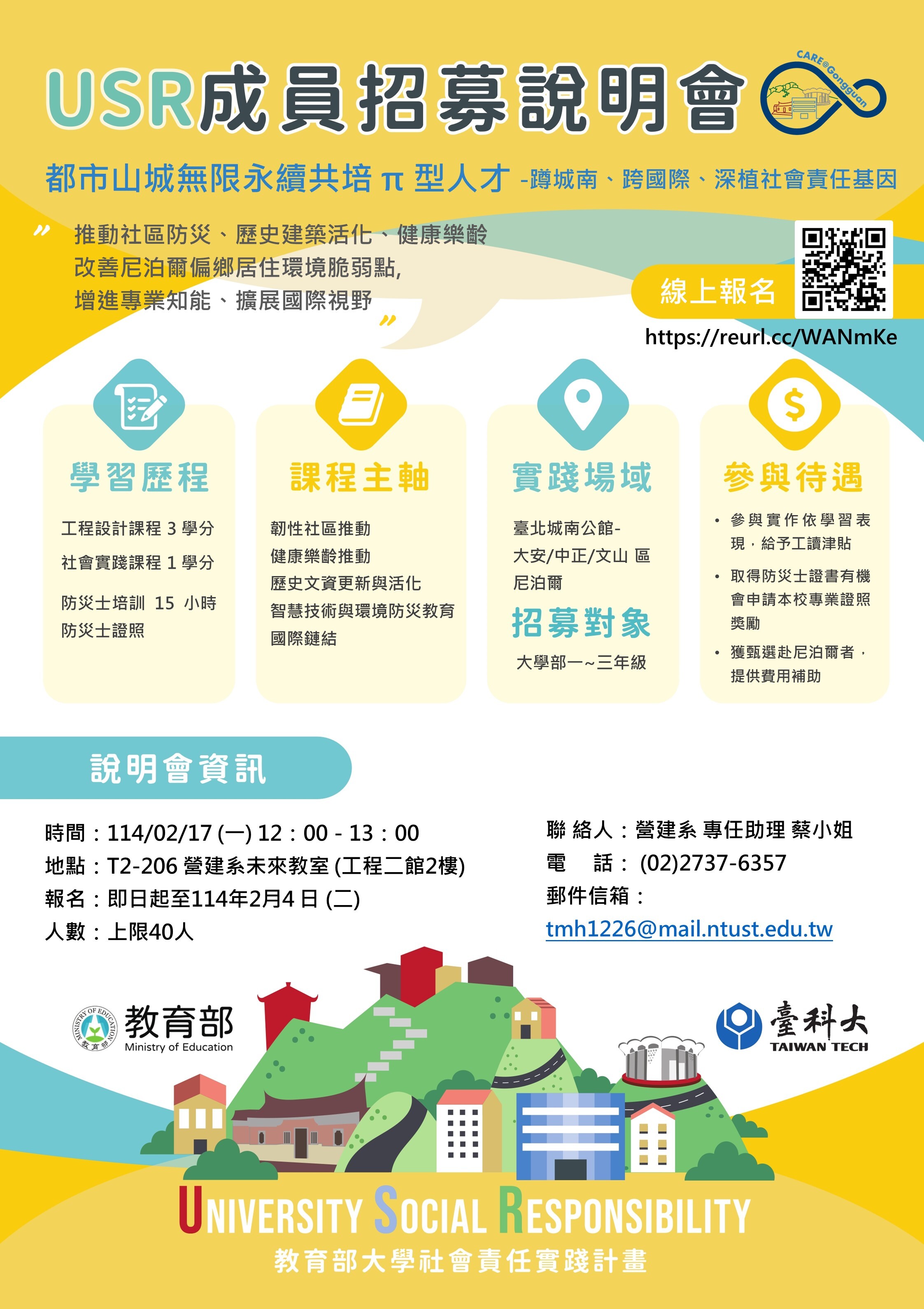 意者請優先採線上報名或洽台科大營建系USR專任助理蔡小姐